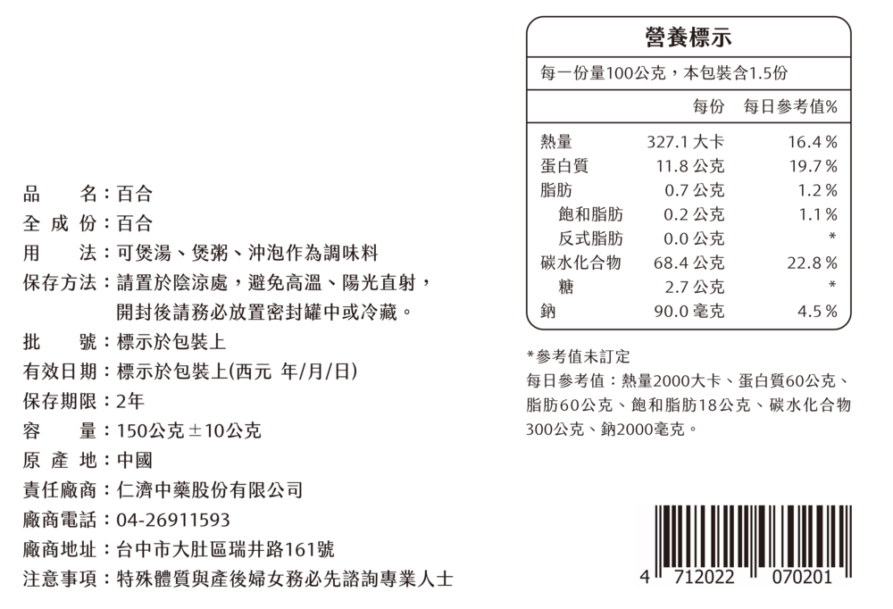 百合只使用成熟的肉質鱗葉,於秋季採挖,收成八小時內,將百合上泥沙清洗乾淨撥取鱗葉,放置沸水中燙至透心,後烘培至乾燥,保持百合天然的色澤不使用漂白、防腐劑及燻二氧化硫的動作,而形成本品,此生產加工過程及進口過程符合無農藥殘留、無重金屬、無燻二氧化硫、無防腐的品質要求。