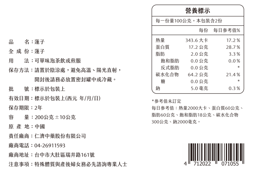 蓮子主要功效為調整體質、幫助維持消化道機能、幫助入睡,我們使用於秋季採收的成熟種子,洗淨,後曬至乾燥,而形成本品,此生產加工過程及進口過程符合無農藥殘留、無重金屬、無燻二氧化硫、無防腐的品質要求。