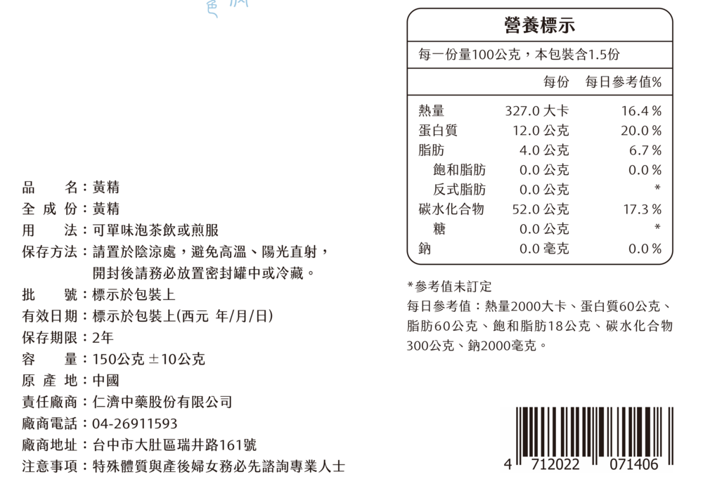 黃精使用於秋二季採收的根莖,將根莖洗淨,後蒸至透心,再晾曬至乾燥,而形成本品,此生產加工過程及進口過程符合無農藥殘留、無重金屬、無燻二氧化硫、無防腐的品質要求。