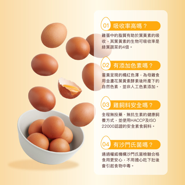 我們深信,只有對土地、環境及對每一位消費者的負責,才能真正為飲食風氣帶來正面影響。選擇我們的葉黃素雞蛋,您不僅品嘗到葉黃素雞蛋的美味,更是參與了推動小農發展與飲食文化的旅程。讓葉黃素雞蛋料理成為您餐桌的主角,輕鬆達成日常葉黃素攝取量,讓我們攜手共創美好的生活。